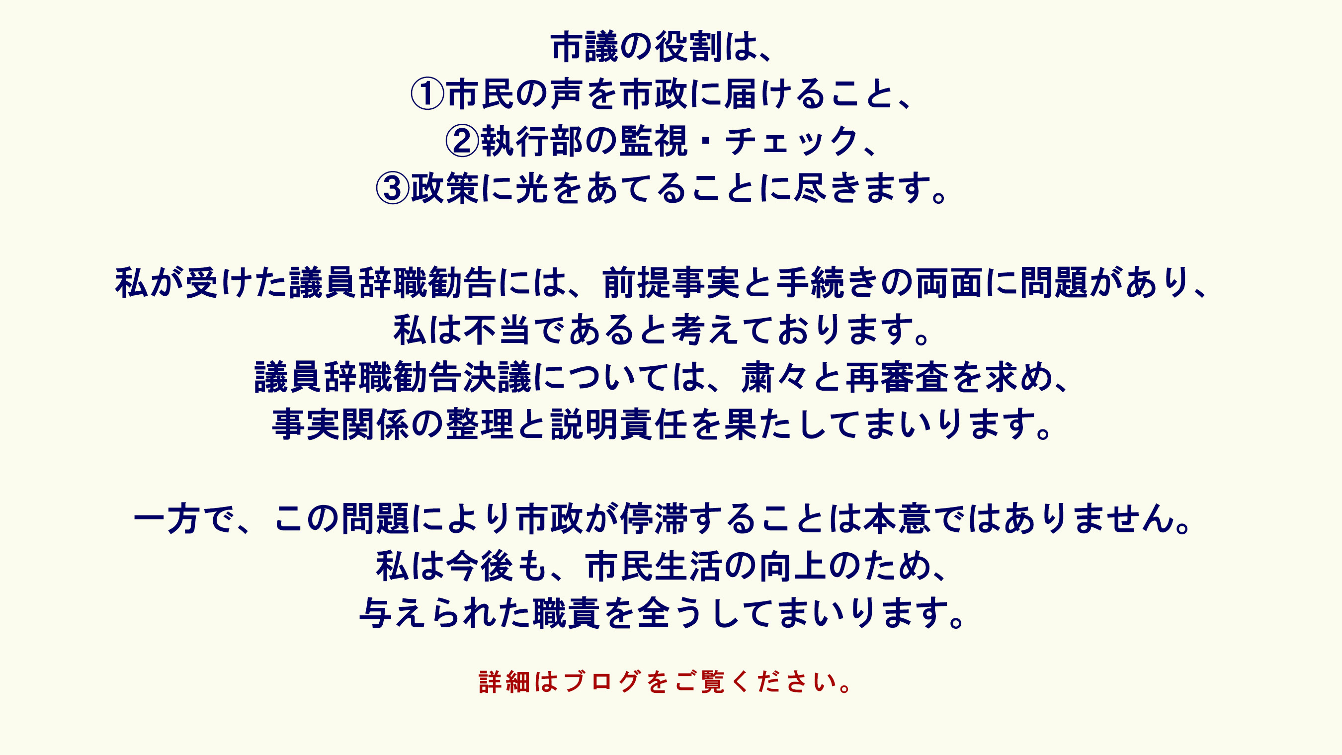 市議の役割は、 ①市民の声を市政に届けること、 ②執行部の監視・チェック、 ③政策に光をあてることに尽きます。 私が受けた議員辞職勧告には ...